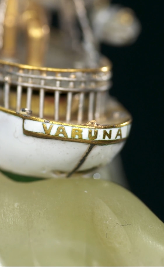 Broche Motifs égyptiens, 1925. Platine, émeraudes, rubis, onyx et diamants, 42 × 59 mm.